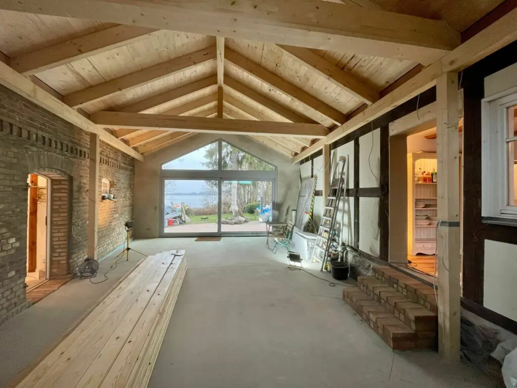 Eine große Glasfassade mit Blick zum See, sichtbare Dachkonstruktion und eine geometrische Anpassung der neuen Dachform an die beiden bestehenden Dächer.