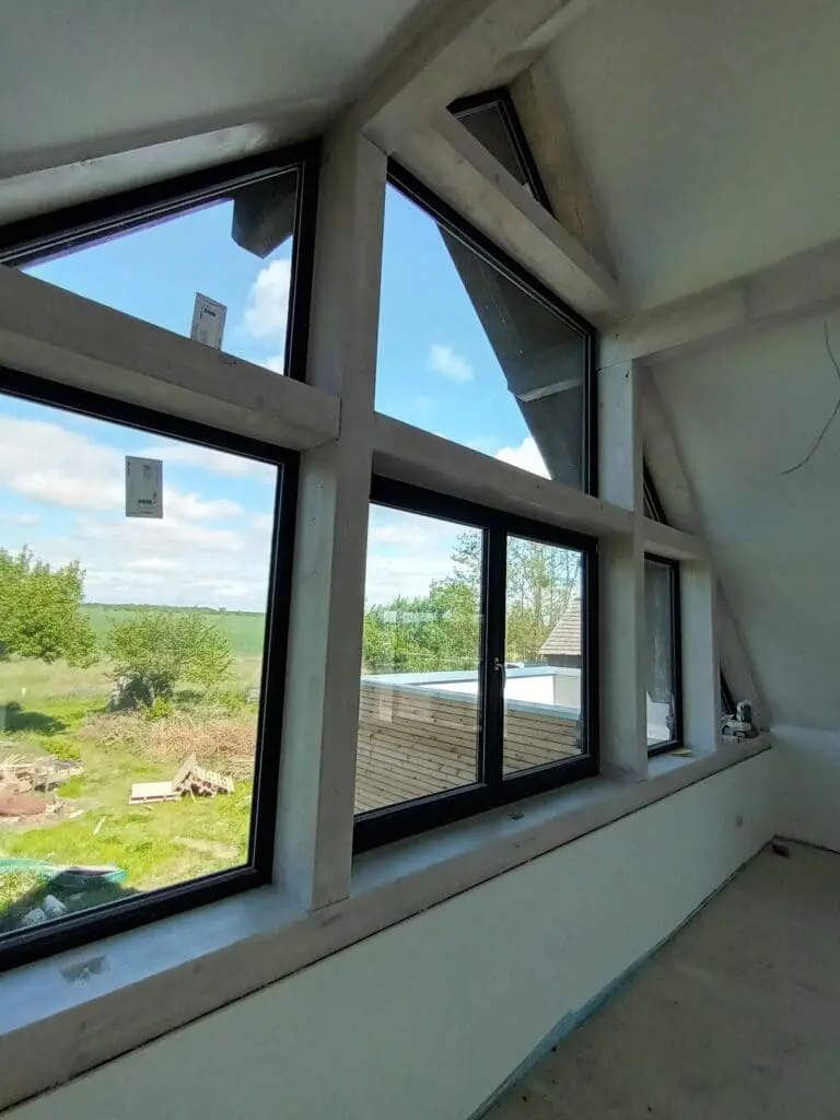 Großzügige Giebelverglasung mit einem atemberaubenden Weitblick in die Landschaft, die das Raumgefühl verstärkt. Die Platzbedürfnisse wurden in zwei Wohneinheiten umgesetzt. Das Design sorgt für Wohlbefinden und entspricht den ästhetischen Wünschen des Kunden.